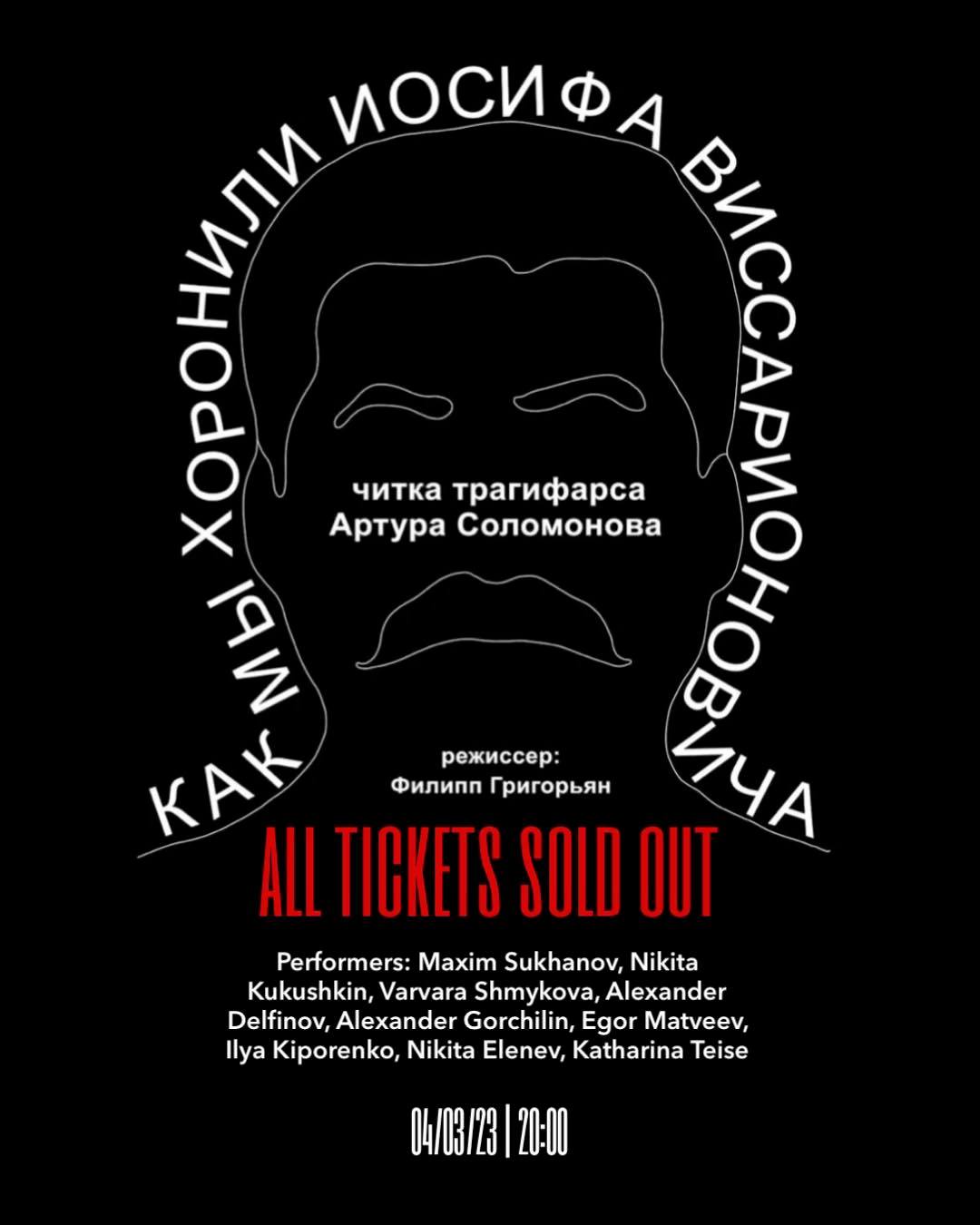 4 марта 2023 года в берлинской “Панде” состоялась театрализованная читка трагифарса “Как мы хоронили Иосифа Виссарионовича” в постановке Филиппа Григоряна.