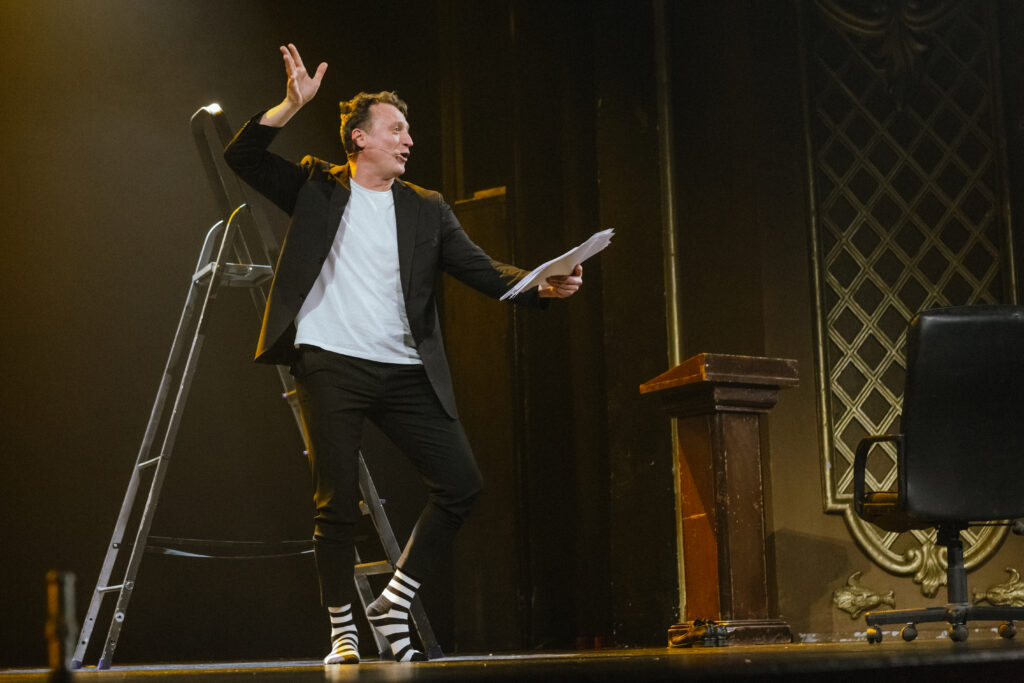 А рядом с ним – Анатолий Белый, солист, премьер, главная звезда шоу. Многие дамы в зале не скрывали, что пришли (а кто-то и приехал издалека), чтобы только на него посмотреть. Никто не разочаровался. Толя – большой артист, умеющий держать зал. Историю Натана Эппельбаума, вознесшегося со «дна» у метро Бабушкинская до кремлевских хором, он берет стремительным штурмом, одним страстным, яростным напором. Белые листы, в которые Толя почти не заглядывает, мелькают и исчезают в его руках по ходу действия, как у иллюзиониста.