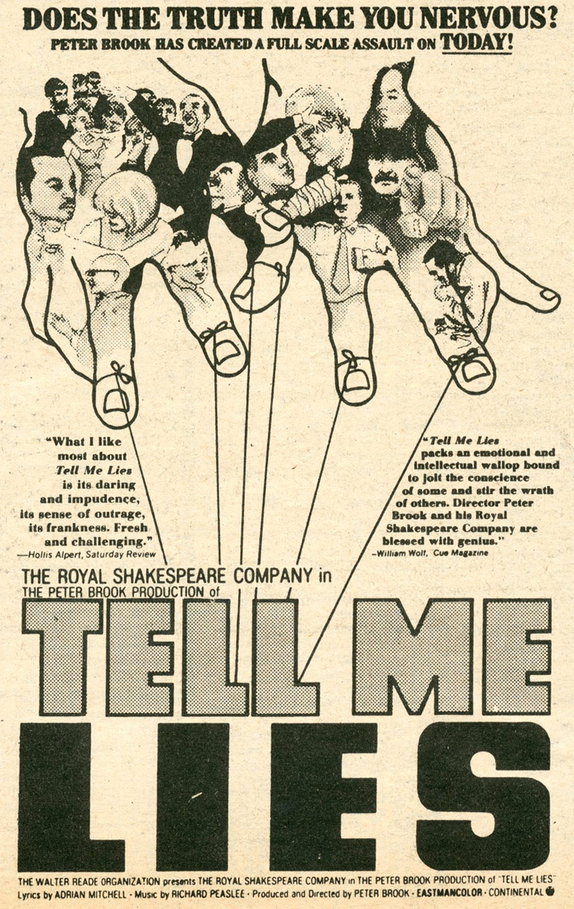 Спектакль “Мы”, поставленный вами в 1966 году, был посвящен войне во Вьетнаме – зверствам американцев в этой стране, их вмешательству в чужую жизнь, иную культуру. Спектакль вызвал большой международный скандал. Потом вы сняли по этой постановке фильм “Лгите мне”. Как вы думаете, на какое событие политической жизни современный театр непременно должен откликнуться?
