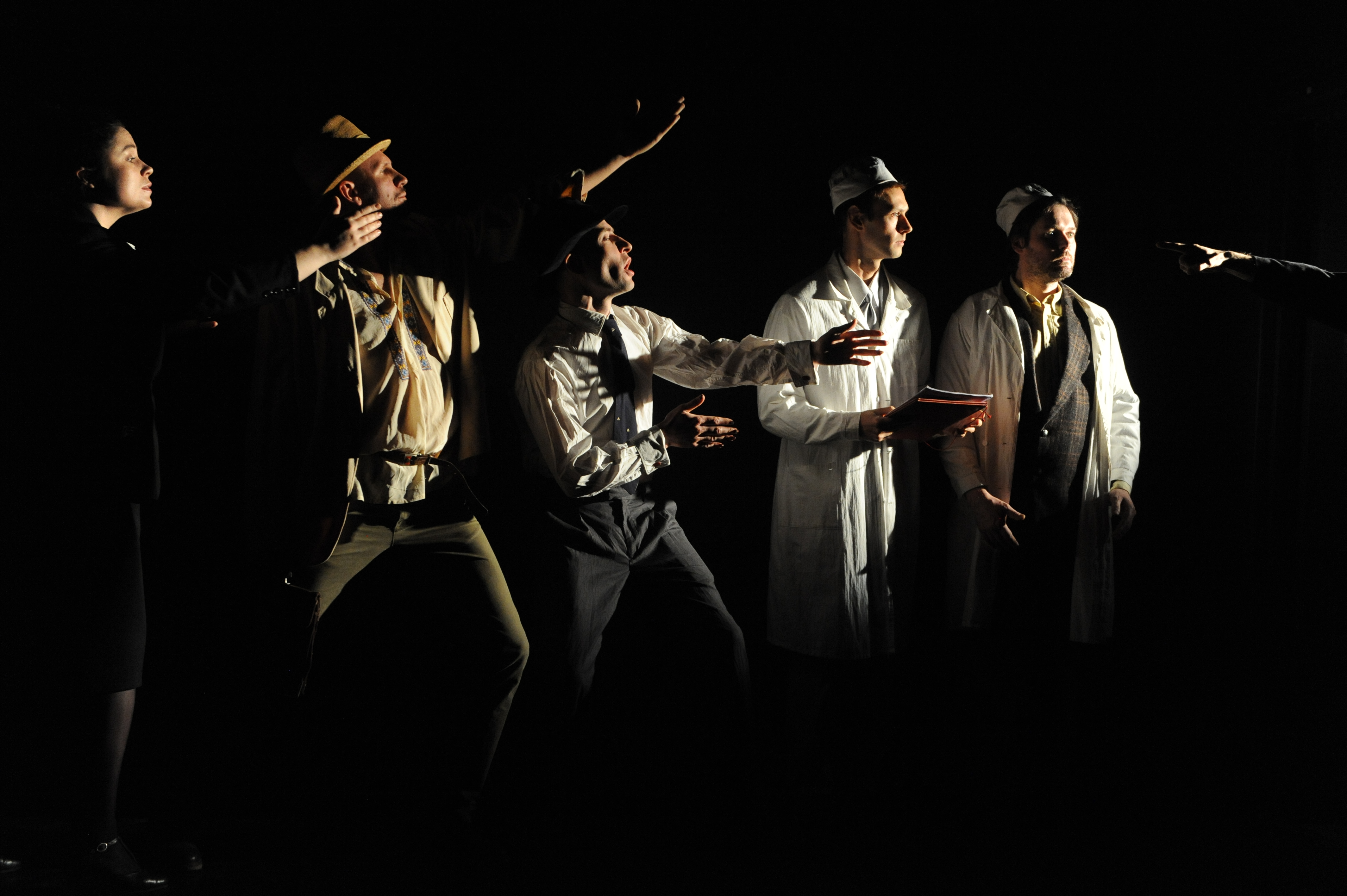 Московский спектакль визуально решён в традиционном доковском стиле – выхолощенные чёрные стены и несколько артистов. Уже самая первая сцена с охранниками Сталина, трясущимися от одного только осознания, что где-то рядом, словно древнее мистическое зло, обитает их правитель, – задаёт спектаклю нервное звучание. Две фигуры, в свете нависающих над ними тусклых источников света, смотрят в зал провалившимися под кепками чёрными глазницами. Увидеть страх в глазах этих людей нельзя, потому что они сами – концентрированный утробный ужас.