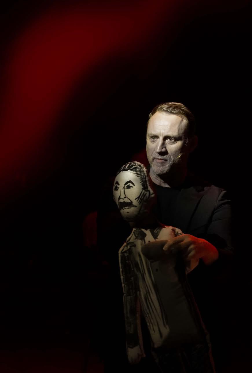 Спектакль «Как мы хоронили Иосифа Виссарионовича» – это театр в театре. Режиссер, обласканный славой фрондер, сочиняет постановку о смерти Сталина. Уморительна неожиданно лирическая пара голубков-охранников (Михаил Уманец и Семен Штейнберг) ,приставленных к полутрупу в ожидании Чайна и Стока под аккомпанемент квартета, недвусмысленно исполняющего «Утомленное солнце» ( совсем не случайно музыканты в этой постановке входят в число персонажей) . Забавен седокудрый Борис Репетур, вопреки своей природе радостно вошедший в роль Ленина.Заставляет охнуть от восхищения миниатюрная Полина Пахомова, обнаруживая в воробьином горлышке оперный голос. Гришковецки мил и обаятелен Юваль Илин в роли Драматурга(режиссер спектакля,экстренно заменивший на прогоне актера ). Страшноватисто не смаргивает мертвыми очами представитель министра нашей культуры(Савва Савельев- режиссер Гоголь-центра, недавно собравший зрителя в Тель-Авиве на премьеру спектакля «Берегите ваши лица»).Уморителен юный Сосо – Никита Олейников. Ну и, конечно, Анатолий Белый! Начинающий свою партитуру роли Режиссера вдохновенно , свободно, весело.Да и музыка играет поначалу так весело. И близок миг премьеры . В меру отважной. В меру мудрой. Без страха и упрека. Пока …товарищ президент всея руси не решит виртуально насладиться искусством театра. Между прочим. За обедом. Между первым и десертом. В 23-м году двадцать первого столетия очевидно, что подают президенту на обед то же, что и Тараканищу на ужин…
