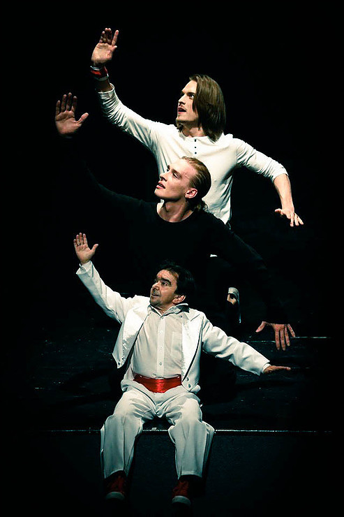 Актера Александра играет Филипп Котов с Таганки, ну то, что еще при Любимове у него были там главные роли в постановках отца основателя, уже говорит само за себя, равно и то, что он прекрасно вписывался в любую режиссуру у Федотова в Макдонахе, Мирзоева в Мудреце , даже у тягучего Букурадзе в “Старшем сыне” – везде хорош. Его соперника, востребованного актера Сергея, играет Антон Даниленко – этот работает с Виктюком. Естественно, пластика и сценическая речь соответственна. Вано Миранян, маленький талисман многих режиссеров, в данном случае показал, что может исполнять не только в большей степени декоративные роли у Григорьяна, Диденко и Могучего, но легко сыграть глубокую драматическую роль актера травести, заключенного практически в тюремные без права освобождения рамки театров для детей. Актеры второго плана не менее яркие и самобытные, чем эта четверка, на сцене гремучая актерская смесь, взрыв мозга неизбежен. Опять же, начиная постановку спектакля о спектакле где Ромео и Джульетта два мужика, можно банально скатиться в копирование стиля Виктюка, но этого не происходит. Виктюк там конечно присутствует незримо, но больше его стиль вести репетиции, не знаю, сам ли постановщик их видел, рассказал ли Даниленко, но мне довелось присутствовать лично – и это очень узнаваемо. Актер играющий Ромео, актер труппы Виктюка подан не в стандартном для себя имидже, а так, как играют Шекспира в труппе Судзуки, Джульетта- парень — скорей к театру Бутусова.