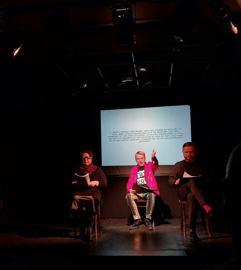 28 декабря в берлинском Theater im Palais прошла премьерная театрализованная читка новой пьесы драматурга Артура Соломонова – трагифарса “Эжен и Самюэль спасаются бегством”. В читке участвовали Ольга Романова, Александр Дельфинов, Максим Курников и Алексей Дедоборщ.