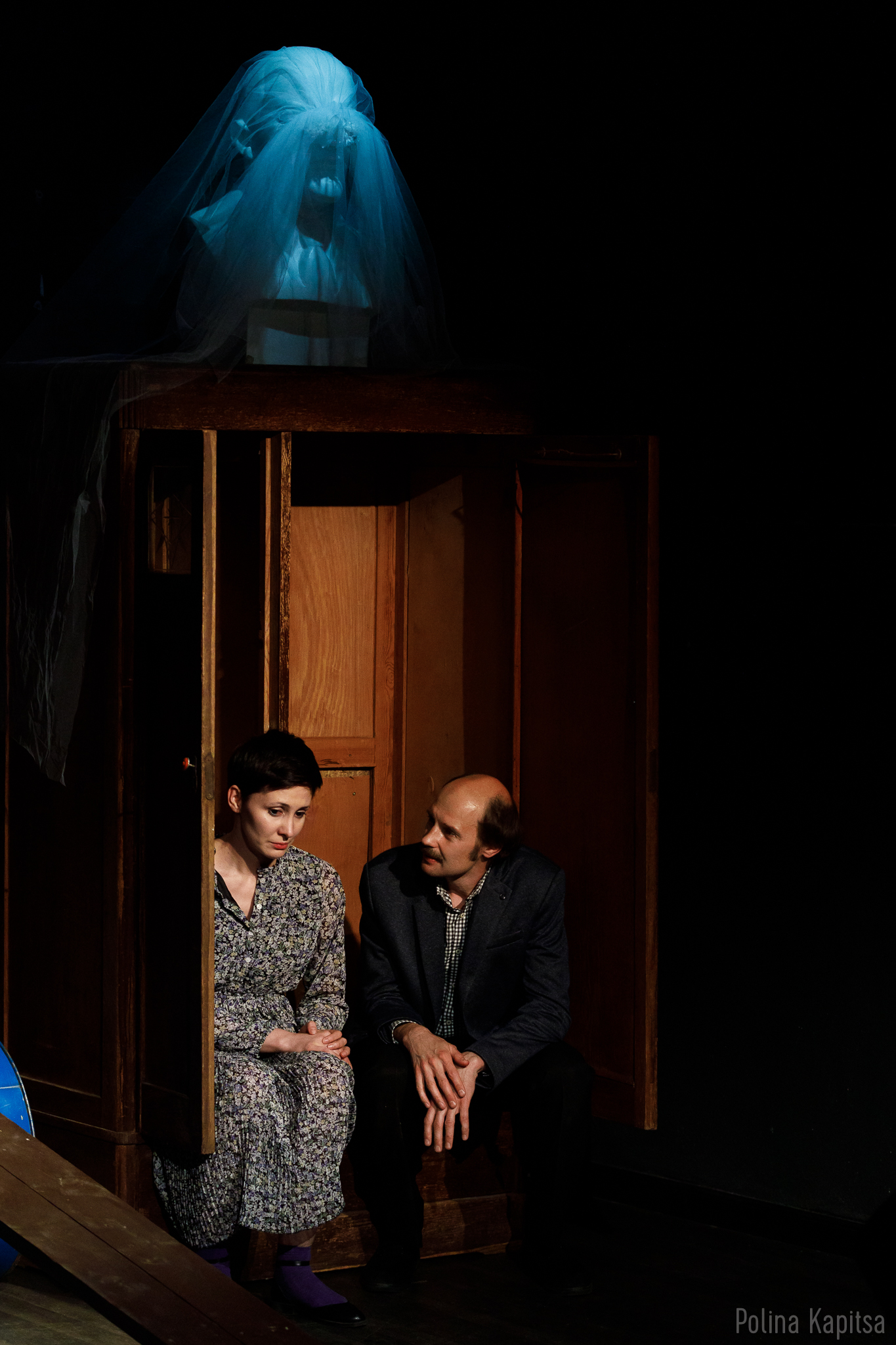 Антикварный многоуваемый шкаф в углу сцены напоминает о быте коммуналок, и этот шкаф среди авангардных блестящих бочек и досок, сам по себе, уже драматический конфликт, даже когда в нём никого нет. Да ещё на шкафу притаился бюст, укутанный белой фатой, точно, как из 30-70-х годах века Ха-Ха. Похожие ваял и мой дед, скульптор, и порой так же в коммунальной квартире, где он обитал, на шкафу в комнате стоял свежий белый гипсовый, неизменно укрытый марлей от пыли.